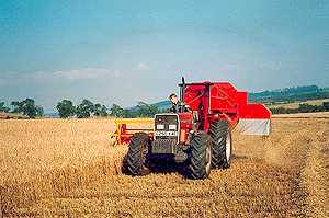 The Harvester cuts, gathers, and threshes the crop in the manner of